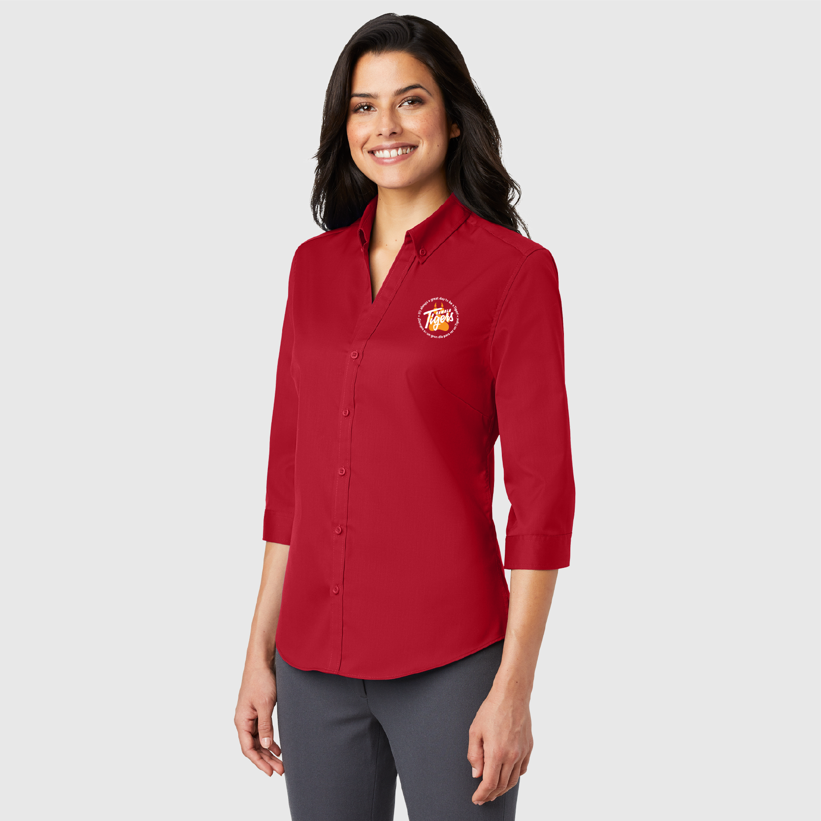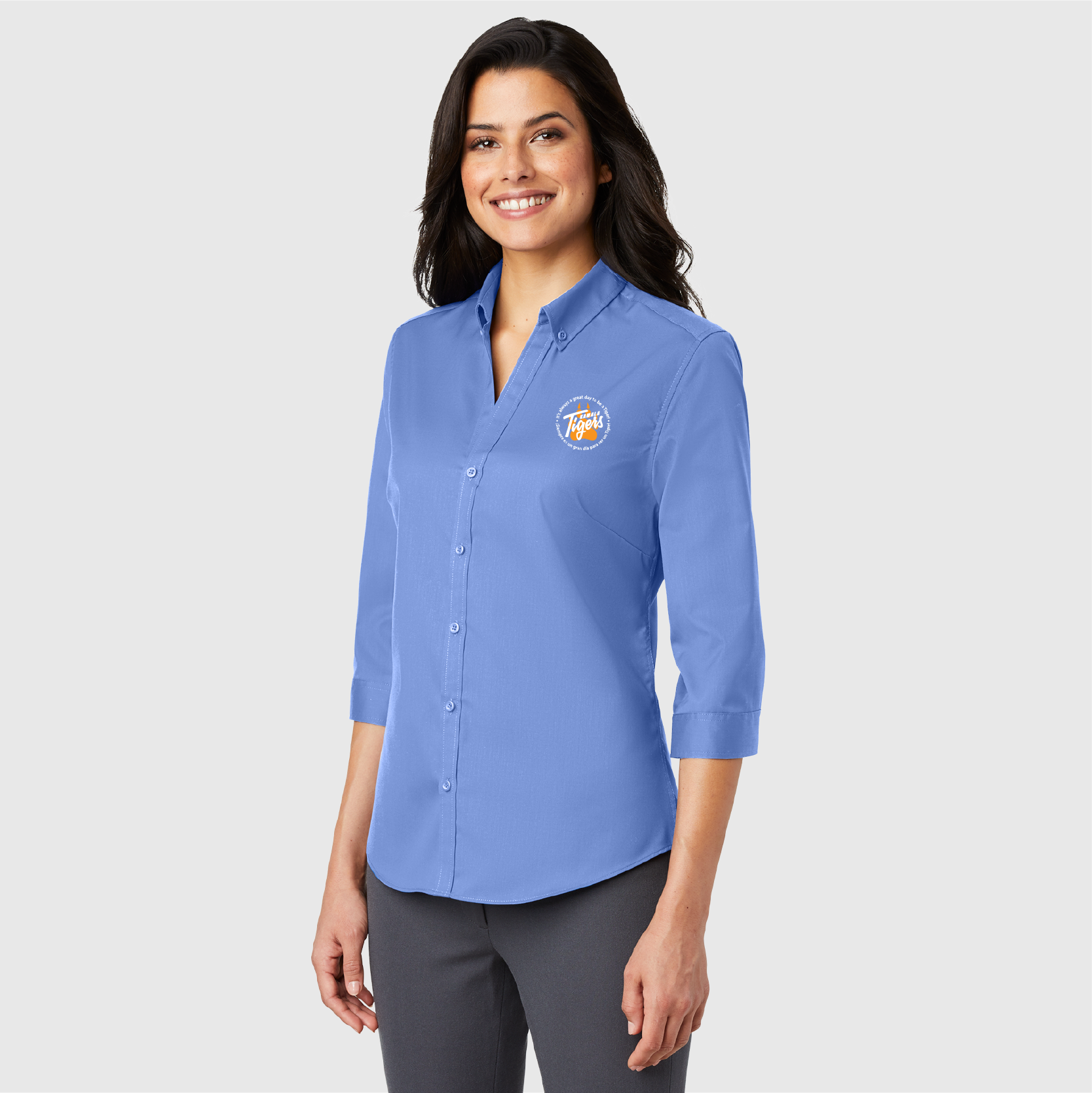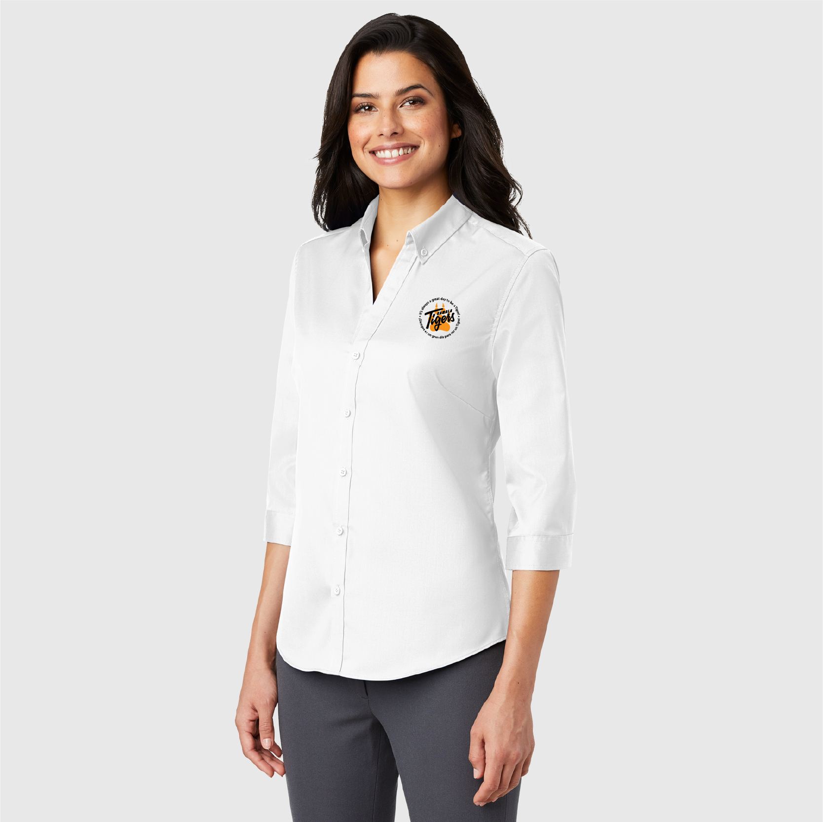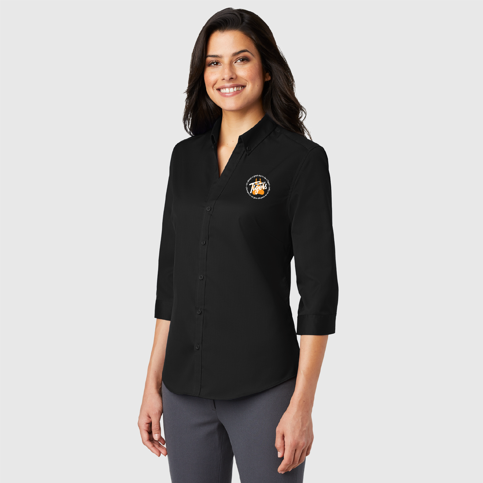 • Button-down collar with open neckline